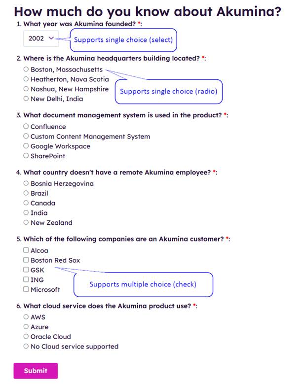 Configure Akumina Flows to create multiple choice questions with scoring ability.
