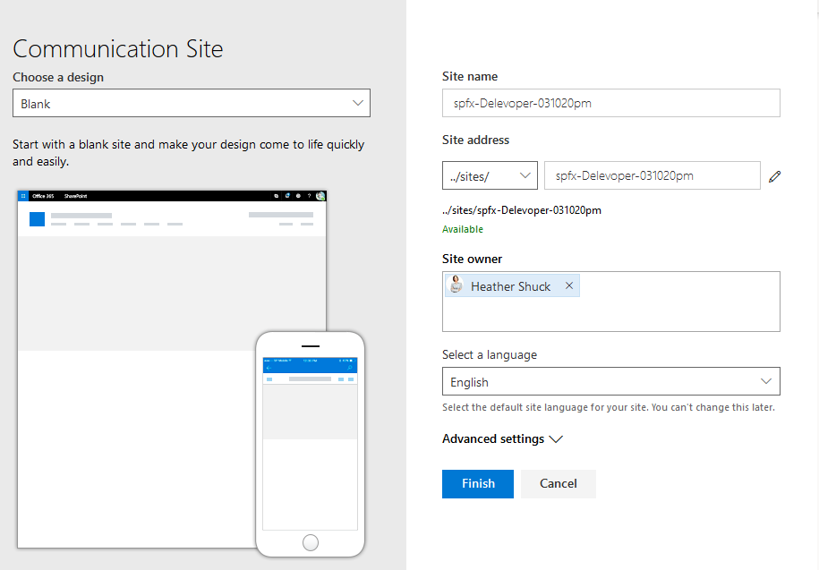 Visit the modern communication site as the user who created the site.