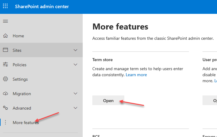 On the SharePoint Admin Center select More Features > Open (Term Store)