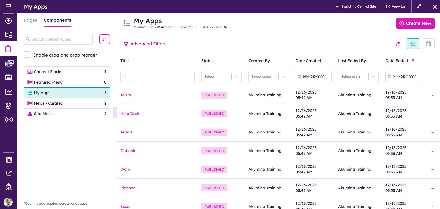 Add Apps also provides search and filter capabilities. Apps with a lock displayed indicates the App is mandated by Corporate and cannot be deleted by a user. Permissioned content owners can manage the list of Apps displayed for all users. On the Voice Rail select the clipboard structured content> Components tab and click on My Apps