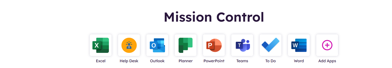 Displays list of Apps available to the current user in Mission Control. The default apps on the Hive site include Outlook, Teams, Excel, Chrome, Word, and Help Desk Apps. The Add Apps allows the users to customize their list of Apps to display on Mission Control.