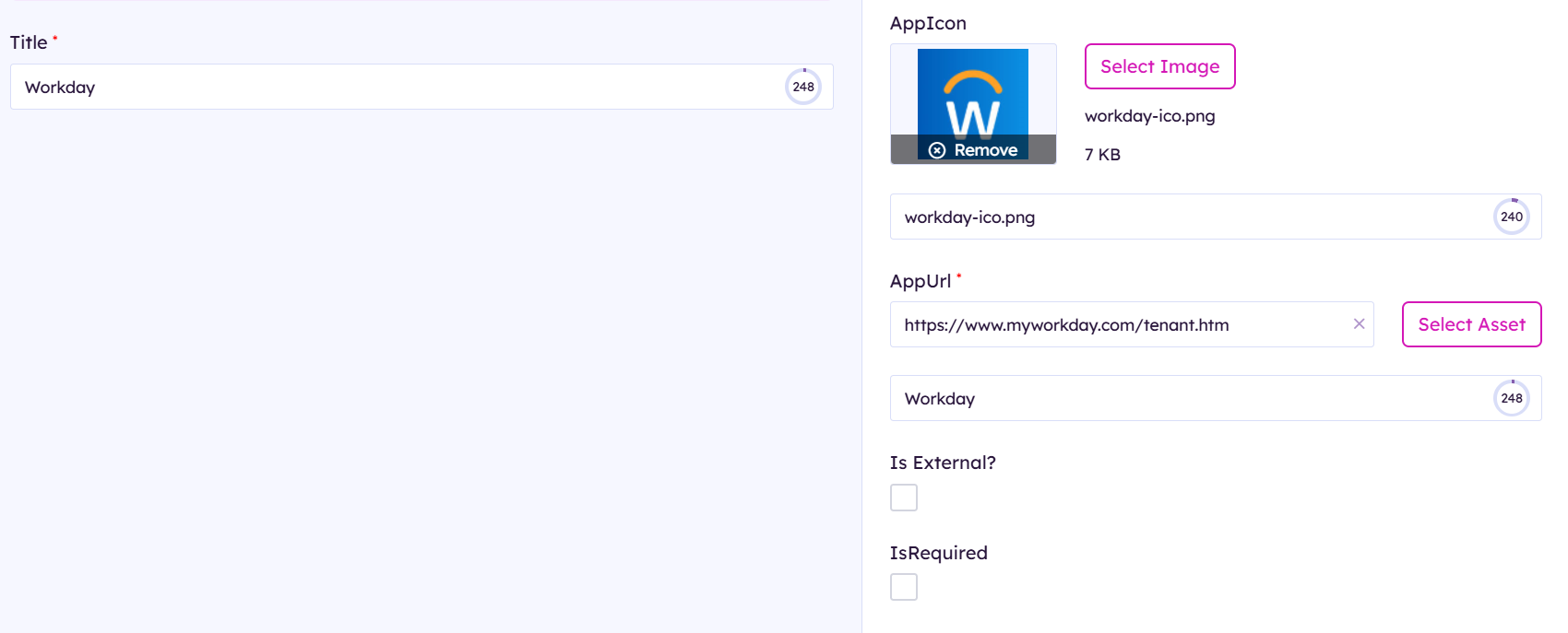 You will need to provide a title, png image, url to the external resource, flag it as an external link IsRequired (optional. If you enable it will be default enabled for your users) if it is not required they can include it as an add on with the Add apps button on the Mission Control