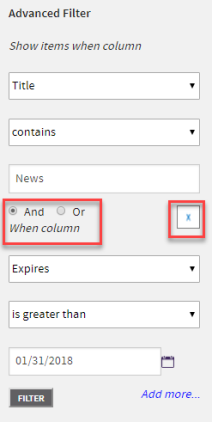 Finally, multiple filters can be logically combined (using “And”, “Or”) to create a compound search. Clicking on the “Add more…” displays another search entry. You can choose the “And/Or” operators between the sections and then click on “Filter” button to see the results. You can add as many additional filters as needed. Clicking on the “X” deletes the associated filter.
