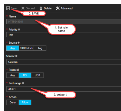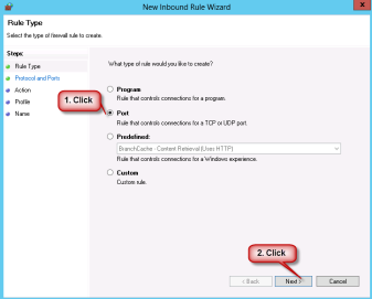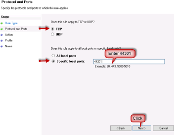 On the “Protocol and Ports” pane, select TCP and Specific local ports, enter port 44301 and click on Next.