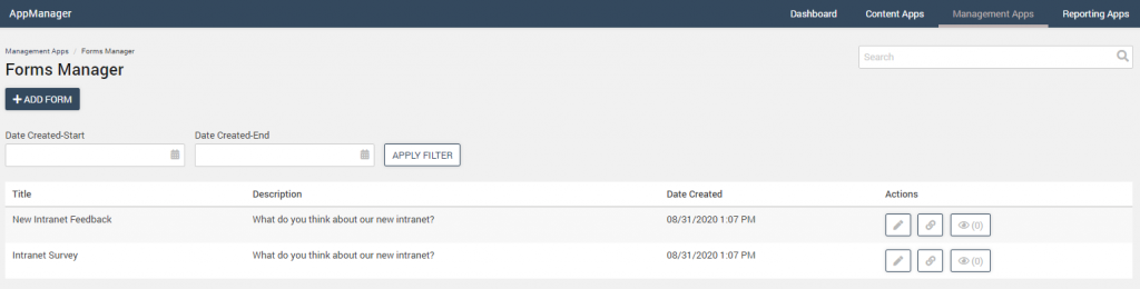 | Forms Manager | Used to create/edit form definitions and view form submissions if forms is enabled in the application. |