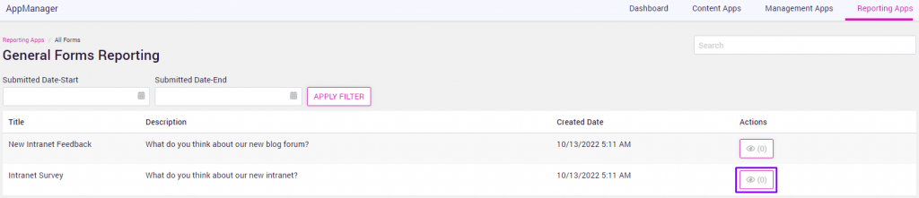 Click on a Forms Reporting App to display the list of submitted form results. Form results are managed and reviewed on the appropriate site.