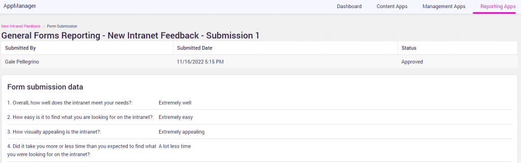 The AppManager Reporting Apps provides authorized users to view the submitted form results on the site/sub-sites. Authorized users are set in the "Reporting Access Group" for the site. The "Reporting Access Group" is defined in the AppManager > Settings > Global settings on the site/sub-site. Click here to learn more details on the AppManager Global Settings.