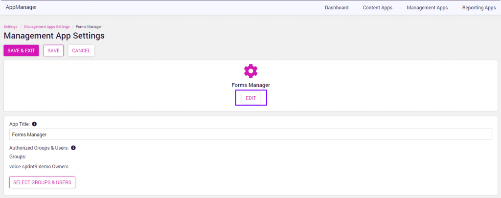 Note: Forms are created for each site/sub-site and managed via the AppManager, in the sites Management App area. In the department site case, the Forms Manager has to be added as a Management App via the AppManager's "Settings" > "Management Settings" and add the "Forms Manager".