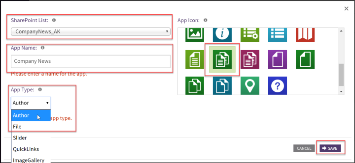 | SORT Field | Not shown in the image above. This field displays when configuring a Quicklinks or Slider App Type. Clicking on “Select” will display the list columns so that the column that contains the order to display items (DisplayOrder) can be selected. |