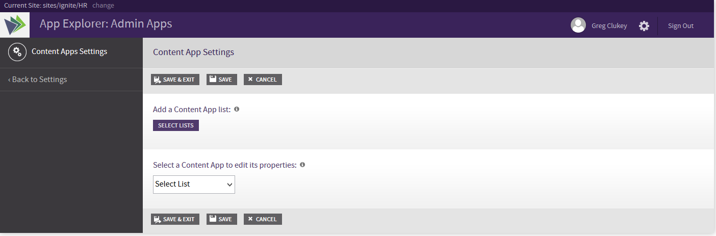 The Content Apps Settings page is displayed