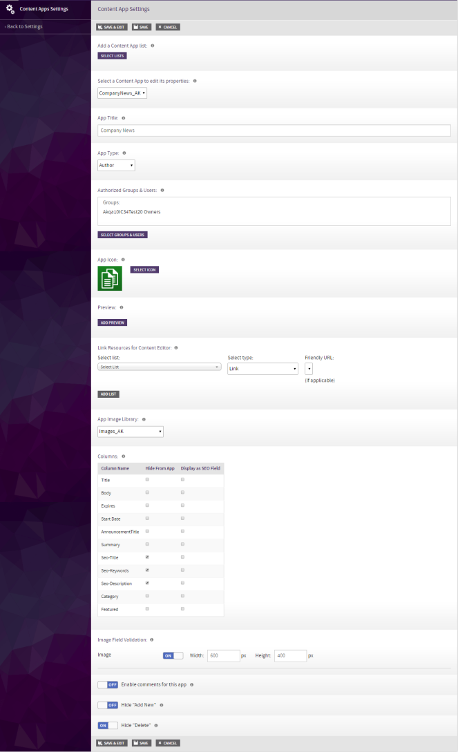 | Image Field Validation | For each image field that is contained in the Content App, an validation selector will be displayed. When validation is turned on for that field, the width and height requirements can be specified. These requirements will be applied when selecting or uploading an image from the AppManager Image Picker. |