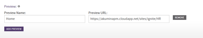 In AppManager, navigate to the Content Setting screen for the target Content App. In the “Preview” section, add at least one site page on which the preview should be viewed (you can add multiple pages if desired using the Add Preview button). This page will appear with the new content to be previewed. The link should be the FULL URL to desired page.