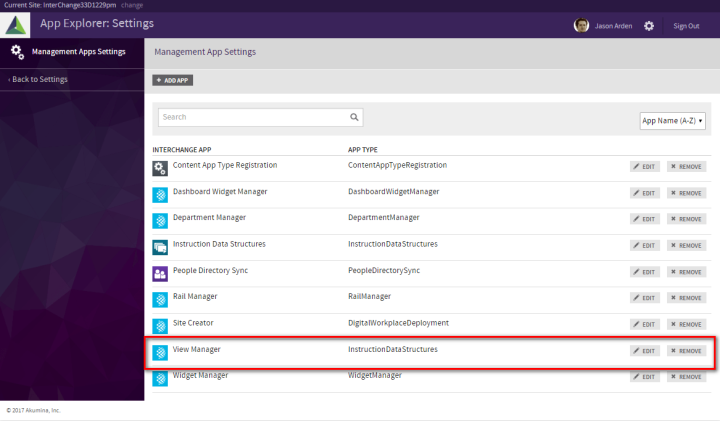 A Management App can also be removed by clicking on its “Remove” () button on the Management Apps listing screen.