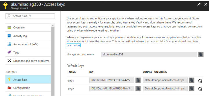 It can take a few minutes for the storage account to be created. Once it appears in the list, click on the entry and navigate to the “Access Keys”. Copy one of the Connection String values and save it to be used in the next step.