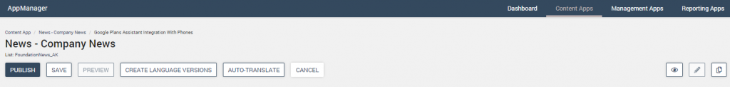 | CANCEL | Cancels all changes since the last save/publish and returns you to the AppManager Content Explorer interface. A confirmation dialog is displayed to ensure you meant to cancel. |