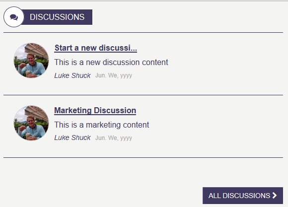 The Discussions Summary on the landing page, displays the five most recently added discussion threads that have been added to the current site Discussions_AK list. Click on the title of a thread and the user will navigate to the selected discussions thread page, where the full thread is displayed and where a user can reply to the thread. Click on "All Discussions’ and the user will navigate to the Discussion listing page where all active discussion threads will be displayed. To learn more about the Discussion Board, click here.