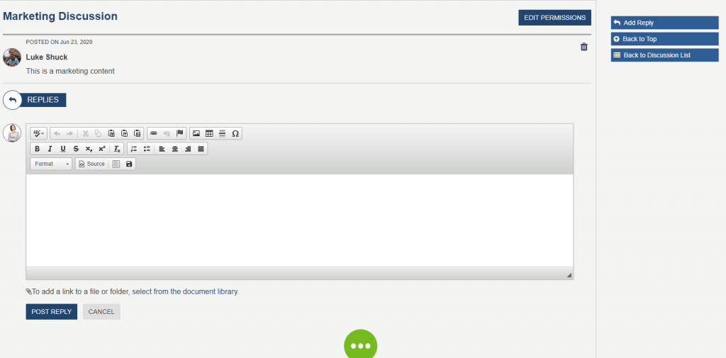 Discussion Thread is an item in the Discussion_AK list. Here users may add replies, edit permissions, delete replies, or delete the thread. When a user clicks into the "Add a reply or attach a file", the WYSIWYG editor will appear, allowing user to add a reply. Click on "select from the document library", a modal will appear, allowing the user to attach a file link to this discussion thread. Click on "EDIT PERMISSIONS", a modal will appear, allow the user to update and specify one or more SharePoint security group who have access and able to view this discussion thread. This widget is not associated with any AppManager app.