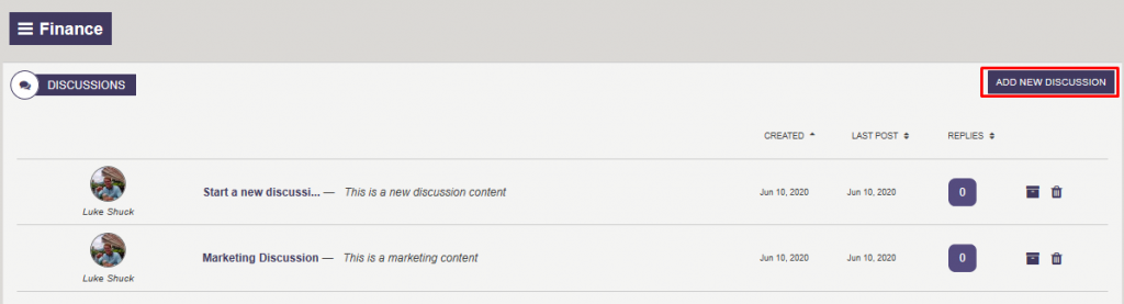 DiscussThread - Department site specific Discussion Board Thread Page, click on a thread on a discussion to add a new thread on this page