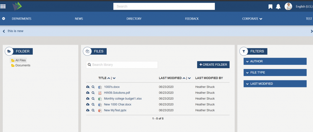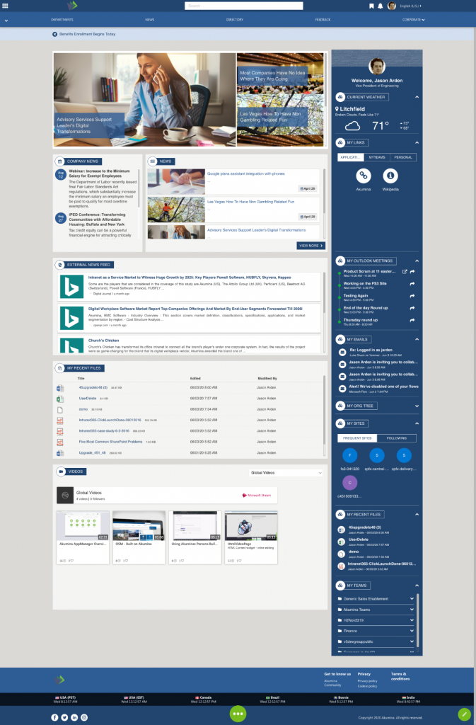 The purpose of this topic is to give an overview of the organization, pages, features and functions that are included in the Akumina FS ‘20 default install for both the Home site and the Department Sub-sites. FS’20 is available with release 4.8 and above.