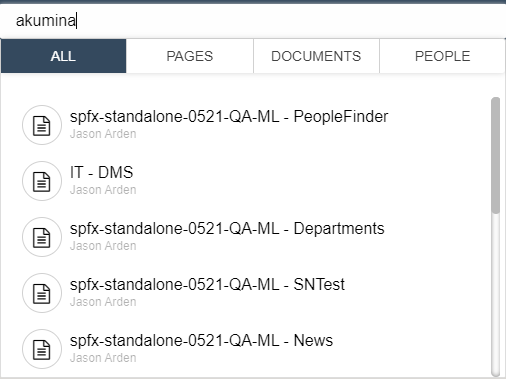 The user navigates to this page by entering in a search term and then clicking on ENTER key. This page displays the search result and facets for the entered term and the appropriate selected tab. Change tab selection from ALL to Pages or Documents, the content will update along with the facets, select a returned result will navigate the user to the appropriate site page. Change the Tab to "People" and the page changes to reflect a similar experience to the People Directory page (including configurable facets), click on a user and the user's Profile Summary Card will display. Update the Search term on the header on the third keystroke the page will update, displaying the appropriate results for the selected search tab. The tabs displayed items and order are managed in the TabWidget properties, click here to learn more about the TabWidget. The TabWidget contains several GenericSearchListWidgets instances (click here to learn more about GenericSearchListWidgets) and a PeopleDirectoryWidget instance (click here to learn more about PeopleDirectoryWidget).
