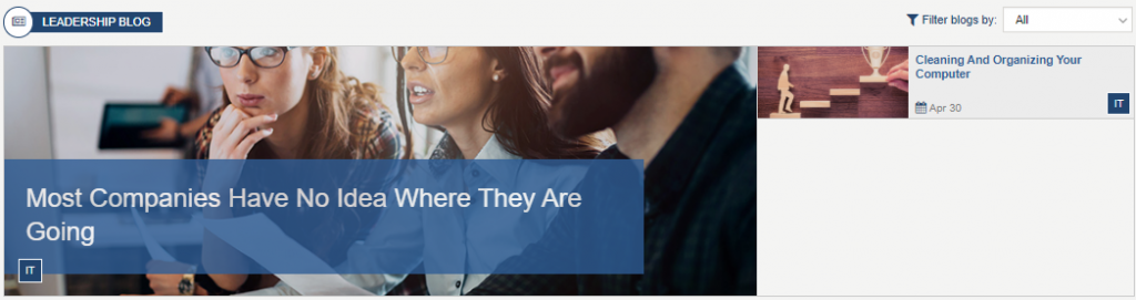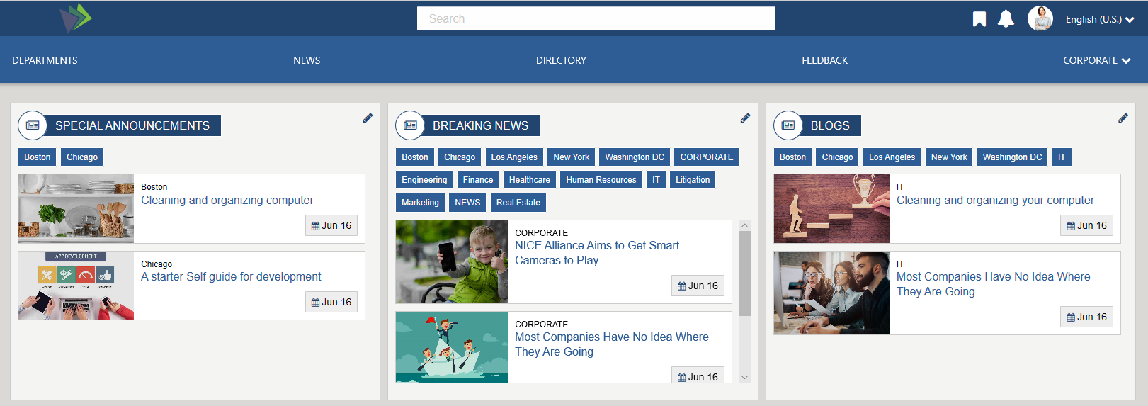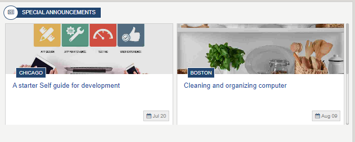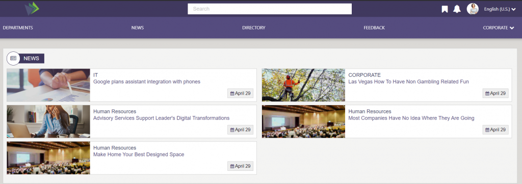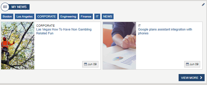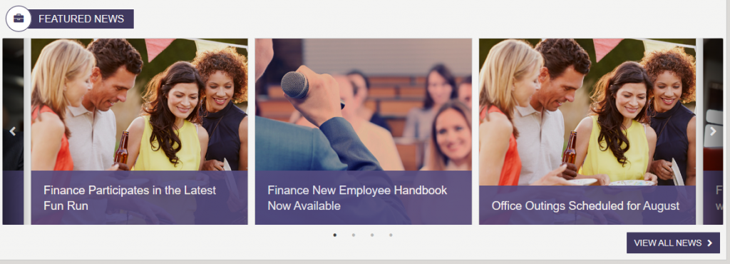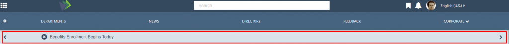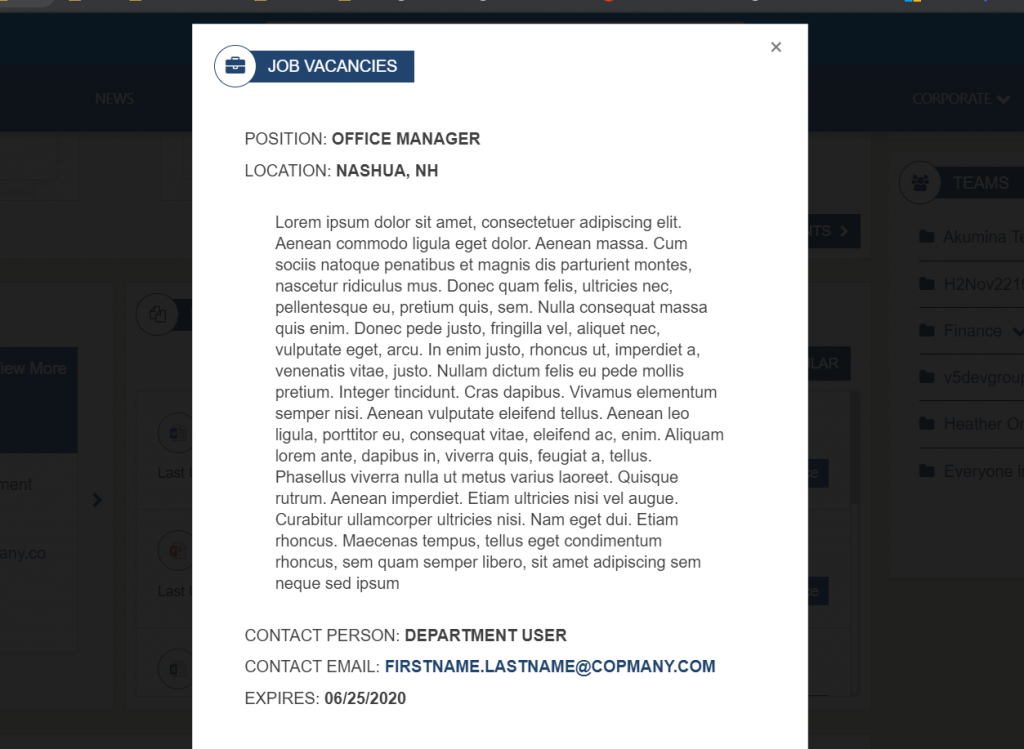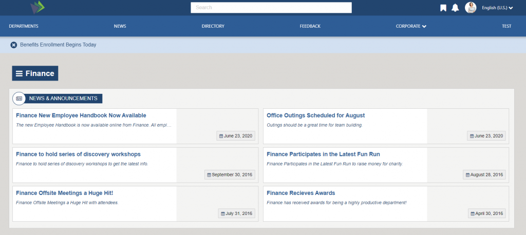 The Dept News Detail Widget dynamically displays the full details of the currently selected article; title, start date, body, and image. News articles can be managed using the Department News app via the Akumina AppManager. To learn more about the DepartmentNewsItemWidget, click here.