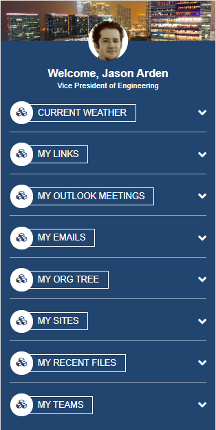 Personal InformationDisplays the current user avatar and users job title. Whether the users preferred background displays above the avatar (as seen here) or the site theme, is configurable via a widget property. The user preferred background comes from the user's profile page on this intranet site and not from delve. The property to display the user's preferred background should only be set if the EmployeeDetailWidget is configured to allow for the user to set their preferred background image.