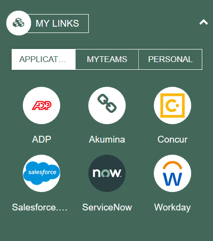 Displays a pop-up modal of My Links including Applications, Teams and Personal customizable links. Teams can be configured on the widget property, to pull in all Teams the user has permissions to or a specific set or even one Team. Click here to learn more about the MyLinksWidget.