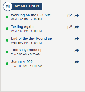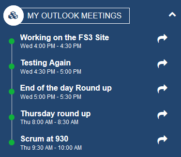My Outlook MeetingsDisplays the upcoming meetings from Outlook and Teams for the current user. Clicking on the item will open the Outlook calendar to join the meeting. When a Teams meeting is upcoming within 30 minutes, a join icon will appear when selected the user can join the meeting right from the intranet. To learn more about the MyOutlookMeetingsWidget, click here.