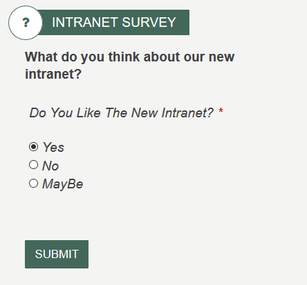 SurveyDisplays the form defined on the widget property and the results of the survey. The Form definition can have one column that is of type "radio-group" that is used to display as the results. The form definition itself can have many columns and even be configured to allow for only one response per user. In the event that the form definition is configure for one response per user (as it is in most surveys) the widget can be configured to display the post back message or always the results after the user has completed the survey. The OOTB Form Widget Instance is just a sample form survey. The overall results of a form widget are managed by the reporting group user in the AppManager. For multilingual sites forms are created in different languages and displayed on this front-end site by creating language version of the same widget instance in the AppManager.