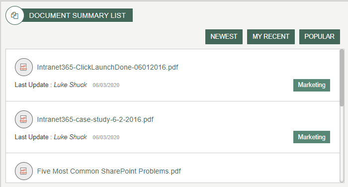 The document summary list is a summary view of documents from the current site’s document library. Documents can be filter by the following categories using the tabbed interface: