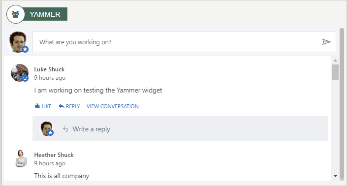 YammerOn this home page the yammer widget is configured to pull in all yammer feeds that the user has permissions to. This YammerWidget can also be configured to pull in a specific yammer group and display the feed to users who have access to the feed. User with permissions can contribute to the yammer groups displayed on this widget. To learn more about the YammerWidget, click here.