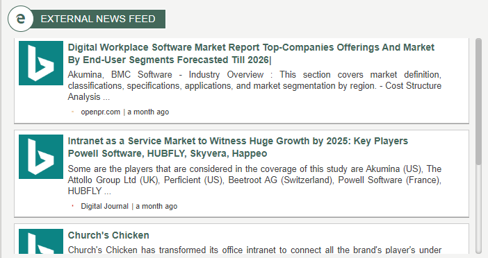 Bing NewsDisplays external news feed from Bing Cognitive Services. This widget requires a "Bing Resources" key. For multilingual create a language version of the widget instance and change the widget property "Market" to point to news from a different language source. To learn more about the BingNewsWidget, click here.