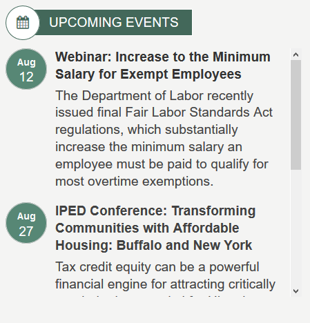 The Calendar page displays events in a tile view or a list view format depending on the user preference (click on the view keys on the page to determine your view). The user can select an event from the calendar, and they will navigate to the event detail page. To learn more about the CalendarWidget, click here.