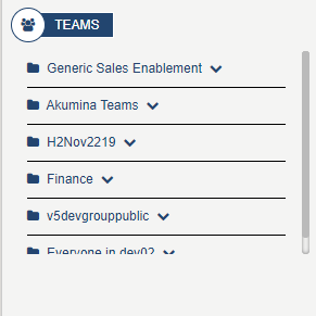 Displays a personalized list of Teams for the current user. This widget allow user to view and access teams and channels that the logged in user belongs too. Specific teams can be targeted on a widget instance using "Target Team" widget property. Example of "Target Team" , would target this widget for those specific teams. If the logged in user has permissions to those teams and channels, then they will see the Team and channels (in expand mode). If the "Target Team" widget property is set to then all teams and channels in which the user has access to will be displayed. Expand a team and click on a channel, will launch the user into the specific team and channel. To learn more about the MyTeamsLinkWidget, click here.