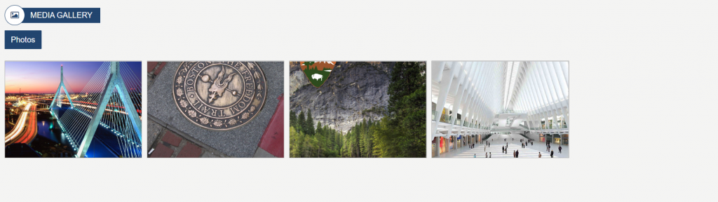 Media GalleryDisplays the photos that have been enabled using the Image Gallery content App. The page is enabled for infinite scroll so will display additional photos as the user scrolls down. Clicking on a photo displays a lightbox window with the larger image. To learn more about the LatestMediaWidget, click here.