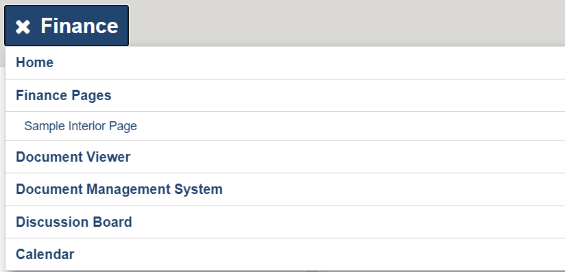 The Department Navigation hamburger menu appears on every page of the Department Sub-site, the widget is set on the department site master page "VirtualMasterPageFoundation-Subsite.html". The Department Navigation displays the site-specific menu items. The Site title, in this case "Finance", is managed on the "Department Menu" Content App in the AppManager, the title of the site is set in the "Root Node Title". Multilingual site titles and menu items are managed in the AppManager by making a Language version of the menu and updating the "Root Node Title" and links appropriately for the new language. This menu supports one level deep of categories. The navigation menu may contain internal and/or external links. Categories can be link able or not. Menu items can be opened in the same window or in a new window (new browser tab). Items in the menu are managed using the Department Menu app for the current subsite located in the AppManager. To learn more about the QuickLinksWidget, click here.