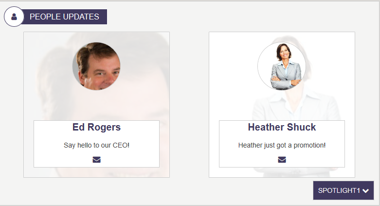 The Employee Spotlight widget displays a profile image, user name, and message. The widget pulls items from the DeptEmployeeSpotlight_AK list. The "SpolightType" which is set to "SPOTLIGHT 1, SPOTLIGHT 2 and SPOTLIGHT 3 OOTB, can be updated to reflect the type of spotlight desired. For example, update the list settings, on DeptEmployeeSpotlight_AK, column "SpotlightType" and set the choice too "Management Team" and "Anniversaries" then add the users, setting their SpotlightType to the new choices. A simple update to the widget property "Spotlight Type", changing: {"Spotlight1":"Spotlight1","Spotlight2":"Spotlight2","Spotlight3":"Spotlight3"} to {"Management Team":"Management Team","Anniversaries":"Anniversaries"}, allows for the desired selector. For multilingual site a language version of the widget instance is created and the the "Spotlight Type" is update to reflect the new desired language, example in Spanish version of the widget instance: {"Management Team":"Equipo de gestión","Anniversaries":"Aniversarios"} (the choices here are mapped to the Spanish titles displayed on the widget). The order in which the users appear, are based upon the order users appear in the supporting AppManager slider app "Employee Spotlight". Click on a user in the "People Updates" and the user will navigate to the employee detail page for the selected user. Left and right chevrons appear and allow the end user to scroll through all users in the "People Update", for the selected SpotlightType.