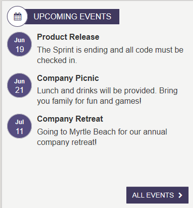 Important DatesDisplays a list of a specified number of events in chronological order using ImportantDate_AK list. (the order in which the events will occur). The number of events displayed is defined on the widget property. This widget can be configured to pull data from a SharePoint list such as ImportantDates_AK or from a calendar. If data is configured from the Important dates then the click event (url) is defined on the item in the Important Dates content app. If the events are configured to come from a calendar, then the clicking on an event will navigate the user to the event detail page for the selected event. To learn more about the ImportantDatesWidget, click here.