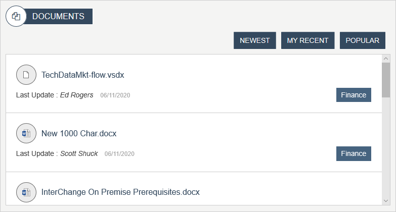 Displays a listing of the most recent documents added to a widget property specified library. Documents can be displayed by Newest, "My Recent" and Popular. On the Root site the widget is configured to pull in documents from the root site as well as department sites, from library with the same name, in OOTB the library is set to Documents. To learn more about the DocumentsSummaryListWidget, click here.