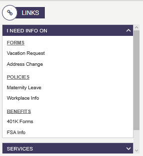 The Department Links displays a set of frequently used Links in a collapsible menu which are specific to the current sub site section. The quicklinks may contain internal and/or external links. Users can also create sub items in the menu that display in a collapsible menu. Items in the menu are managed using the Quicklinks App for the current subsite located in the AppManager. This view of quicklinks support two category levels deep. The OOTB content is managed in AppManagers department site in quicklink content App "Quicklinks". The data is stored in Quicklinks_AK SharePoint list. To learn more about the QuickLinksWidget, click here.