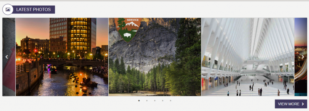 Displays the photos that have been enabled using the Image Gallery content App. The page is enabled as a slider app with an infinite scroll chevrons all the user to continue to scroll left and right. Clicking on a photo, a lightbox window with the larger image will display. Clicking on "View More", navigates the user to the department photo gallery page. To learn more about the LatestMediaWidget, click here.