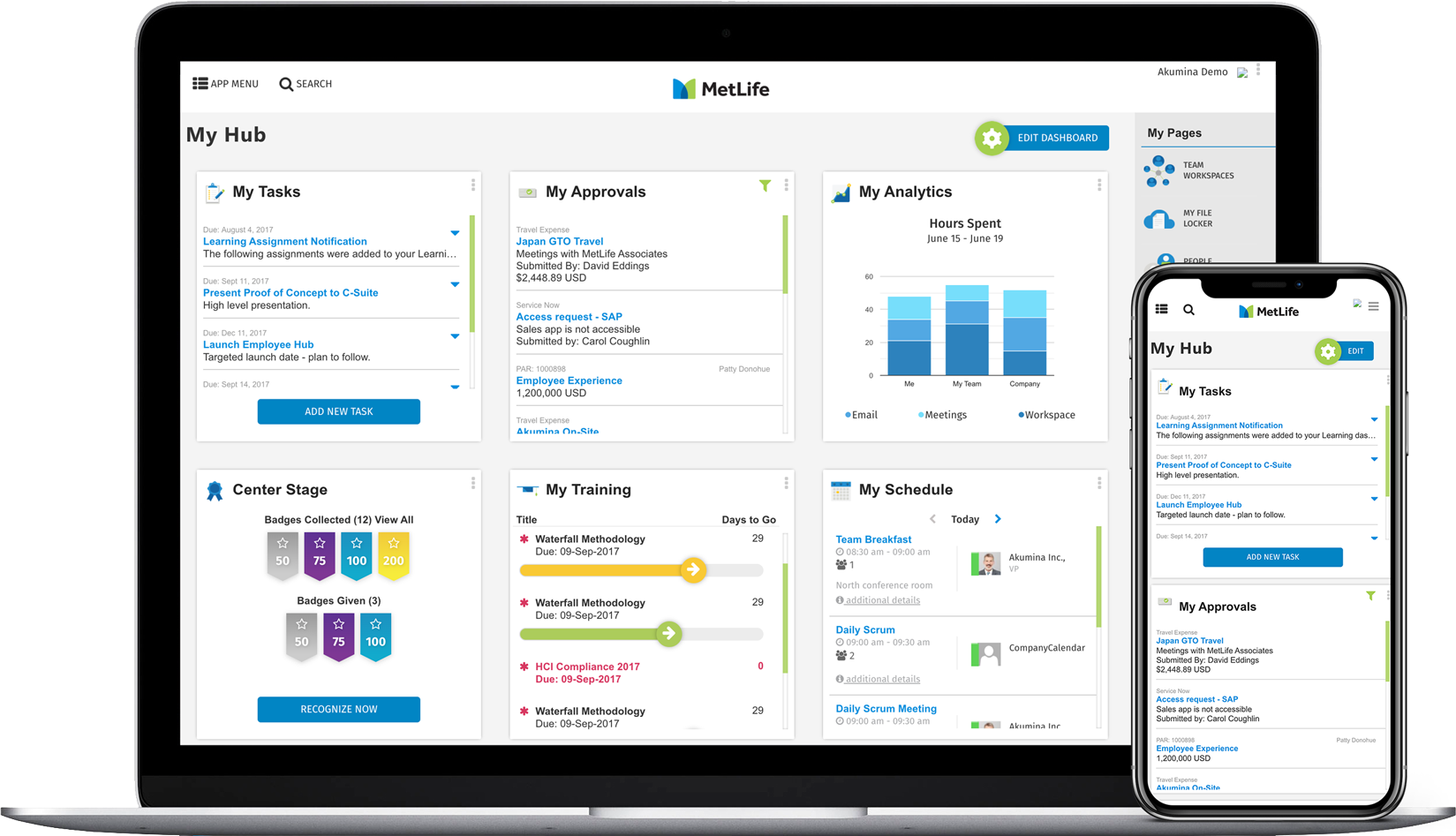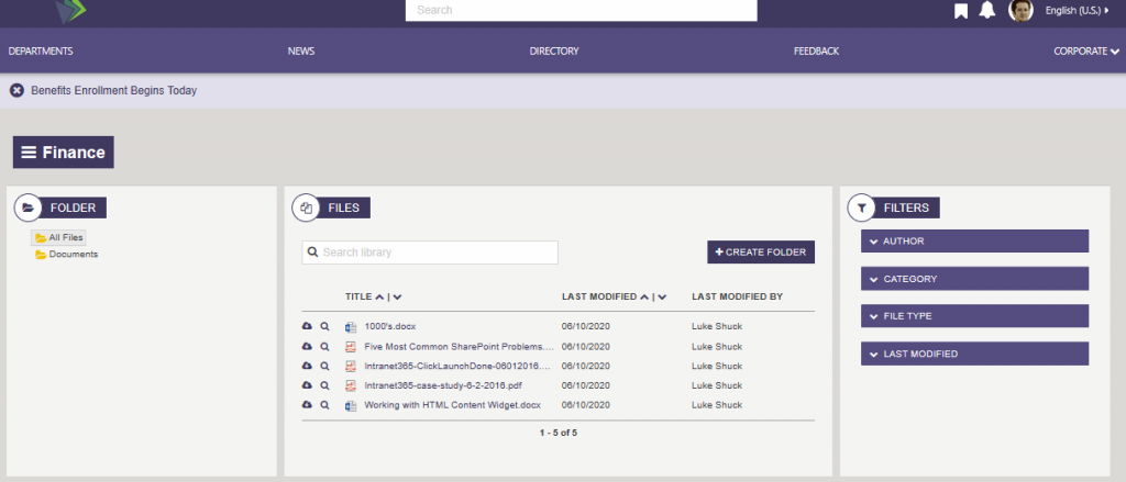 The Akumina Document Viewer Widget is a search-based document listing solution that combines a folder tree view, document list and search filters/refiners into one easy to use interface. Because it is a search-based widget, it has the capacity and performance to search, filter and display libraries with tens of thousands of documents, while still providing the ability to add new files via drag and drop, edit and share documents. To learn more about the DocumentViewerWidget, click here.