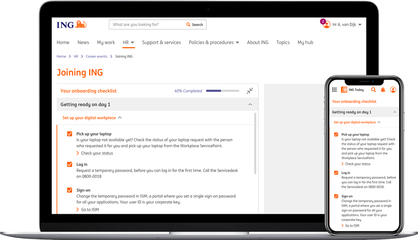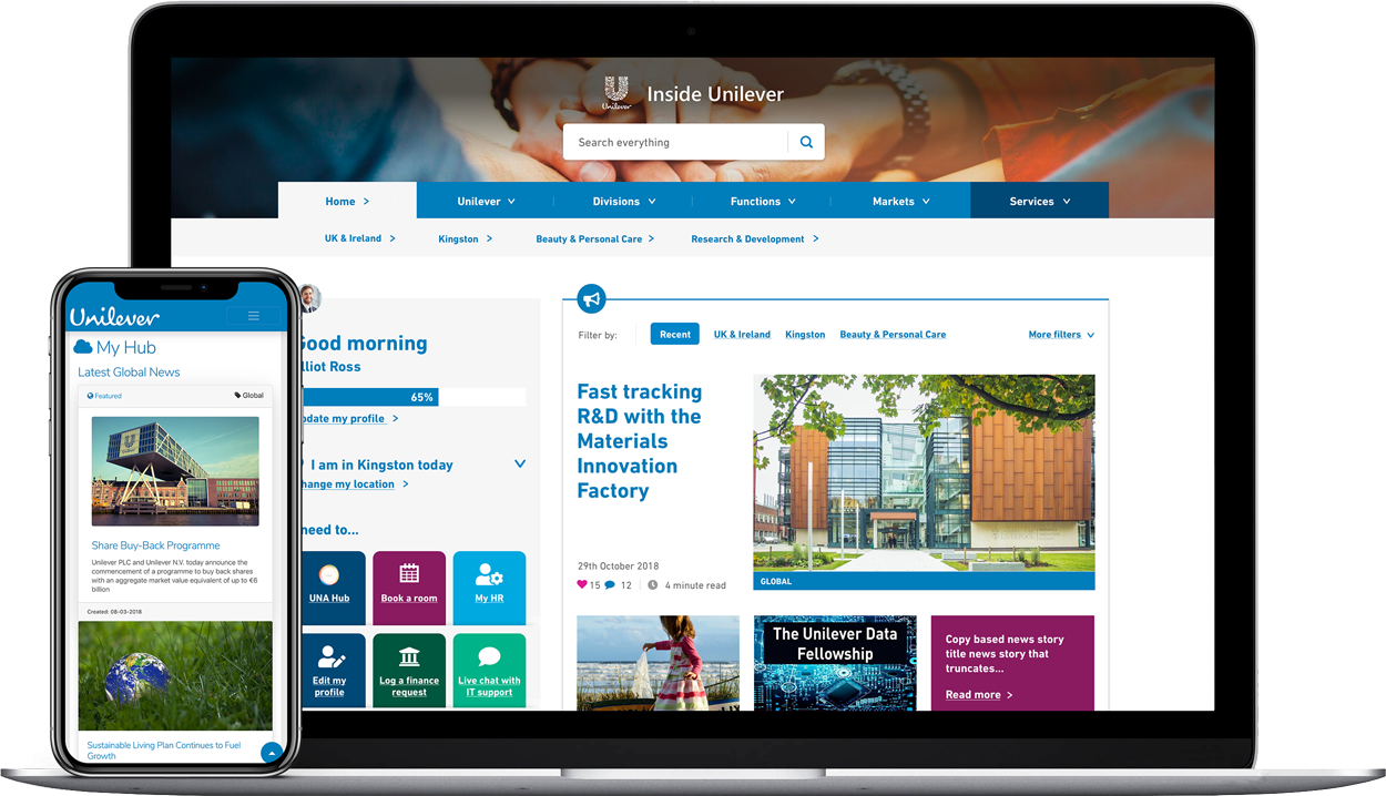 User ProfileAllows the user to view and edit their SharePoint User Profile information and log out of the intranet site. These items are found on the master page, labels are managed in the language files for multilingual.