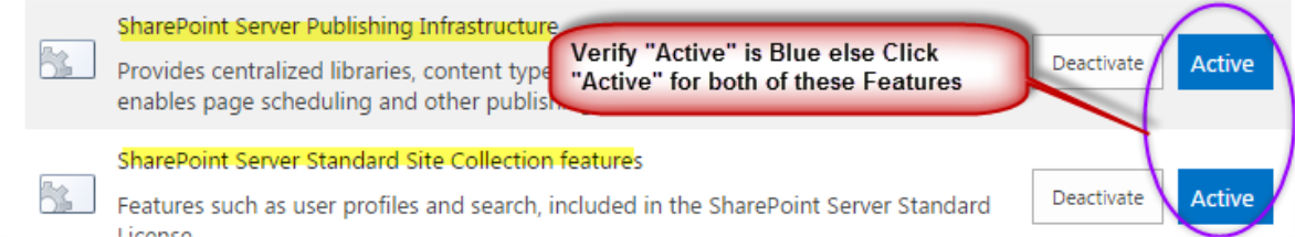 IMPORTANT: Ensure that the user who will be setting up AppManager and deploying the Akumina Foundation site is in the OWNERS group for the parent site of the Site Collection. It is not sufficient for that user to just be a Site Collection administrator. Enable Specific “Site Collection Features”On the “Site Settings > Site collection features” (found under Site Collection Administration) page, verify the following features are ACTIVE:
