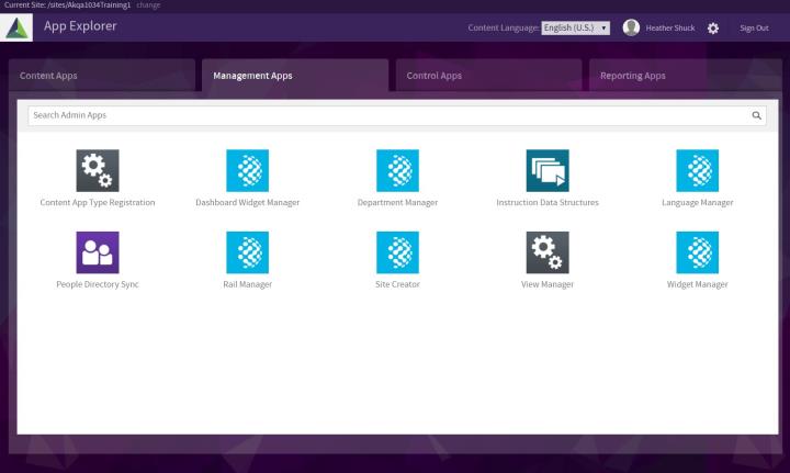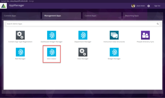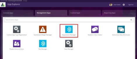 This step can be done at any time, and whenever you add a new department to the site. This mapping is used to determine, when using targeting, the correct department targeted content for the current logged in user. To perform the mapping, access the “Department Manager” in the Management Apps tab.