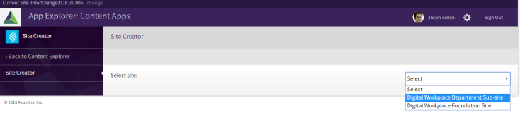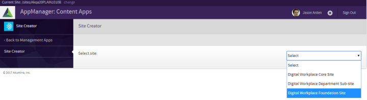 The first step is to create the Site Collection into which you want to add the Akumina Foundation site. Once the Site Collection is created and configured, add the AppManager App to the root of the Site Collection (see separate documents “Installing AppManager in the Cloud” or “Installing AppManager on Premises” for details of installing AppManager and connecting to your site collection).