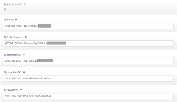 See the topic “Graph API Connection for Azure AD” for details on how to obtain the Client ID, AAD Client Secret, Subscription ID, SkypeApiKeyCC and SkypeApiKey.