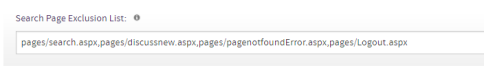 This is a list of the pages which you want to EXCLUDE from the search results. A page listed here will not be crawled by the search engine. Pages are separated by commas and can use a relative URL path. The default search, page not found and logout pages are automatically populated in this field. You can add additional pages now or after the site deploy.