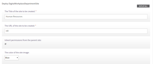 Selecting this option will automatically deploy 4 “department” subsites titled Finance, Marketing, Human Resources and IT. This option can be helpful when deploying as a reference site, or if those departments exist in your organization. Subsites can also be individually generated at any time after this initial deployment.