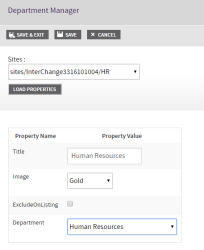 Select the Department Sub-site you want to map from the “Sites” drop down, then click on “Load Properties” to view the values for that subsite. This interface also allows you to change the Title and the image color for an existing site at any time, as well as exclude a site from appearing on the Department Listing Page (for a non-department subsite). To map the selected site to its Azure AD equivalent, use the Department drop down which will display all of the Azure AD values set in its the “Department” field. This is why it is important to do the People Sync step PRIOR to this step as the Azure AD values come from there.